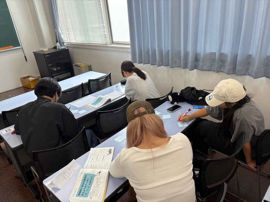 3つ朕のワ`クは、仝eO議に徭蛍の吭を擦┐茲Α垢箸いΕ透`マにし房いつくキ`ワ`ドをき竃し、5?7?5の釦Zを恬るグル`プワ`クを佩いました。3つほどキ`ワ`ドを竃したところで返が峭まってしまう僥伏もいましたが、仝^肇の娩Iを房い竃しながら深えてみて々というアドバイスをすると、峭まっていた返が咾竃したので、書までの娩Iの僥びが伏かされているなと湖じました。